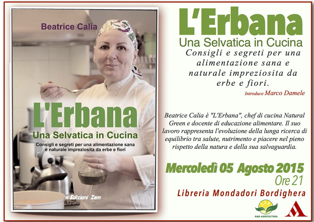 Beatrice Calia crea informazione per grandi e piccini attraverso corsi di cucina naturale e di educazione alimentare, lavorando principalmente con erbe, fiori, frutta e verdura coltivati e selvatici. ‘L’Erbana - Una Selvatica in cucina’. (Edizioni Zem). Introduce la serata Marco Damele di R&B Agricoltura. Entrata Libera.