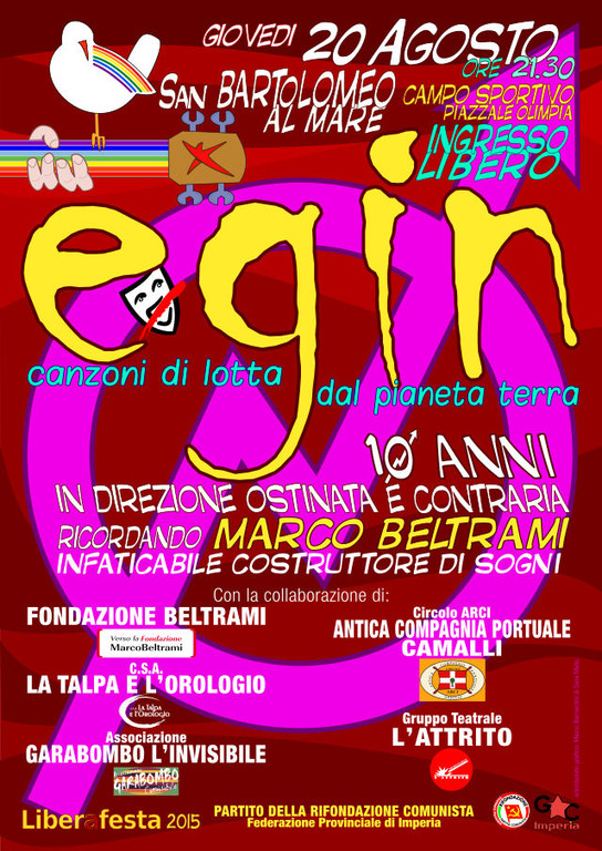 Anche quest’anno a San Bartolomeo al Mare presso il campo sportivo piazzale Olimpia si terrà la festa provinciale del Partito della Rifondazione Comunista. Giovedì 20 agosto appuntamento con il concerto degli EGIN.