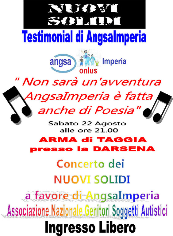 Domani, sabato 22 agosto alle ore 21.00 a Arma di Taggia presso la Darsena, i Nuovi Solidi – Tribute Band Lucio Battisti, Testimonial per il ponente di ANGSA Imperia, terranno un concerto a sostegno dell’Associazione Nazionale Genitori Soggetti Autistici di Imperia. Ingresso Libero