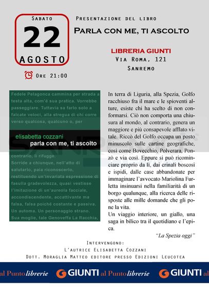 Alle ore 21.00 sabato 22 agosto l'autrice Elisabetta Cozzani presenterà, assieme all'editore Matteo Moraglia, il suo libro pronta a soddisfare le curiosità dei lettori.