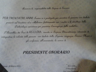 "Il Presidente Traversa ha quindi donato a Tonino Musa una preziosa targa su ardesia e una pergamena nella quale si ricorda l'attività condotta nel corso di trentatré anni a favore dei diabetici della città di Sanremo e in collaborazione con i medici e le strutture della diabetologia sanremese per prevenire l'insorgenza della malattia. Nel corso degli anni, infatti, la locale sezione AS.LI.DIA. si è distinta per la realizzazione di corsi di educazione sanitaria, mirati alla diffusione di informazioni su una corretta alimentazione e in generale alla gestione delle varie problematiche riconducibile a questa importante patologia che in Italia colpisce il 5,5% delle persone, pari a oltre tre milioni di individui, e in Liguria riguarda il 3,9% della popolazione.