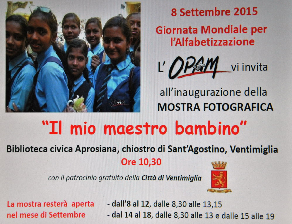 In occasione della ‘Giornata Mondiale per l'Alfabetizzazione’, quest’oggi alla Biblioteca Aprosiana a Ventimiglia in piazza Bassi (ex via Cavour), verrà inaugurata la mostra fotografica ‘Il mio maestro bambino’ a cura dell'OPAM.