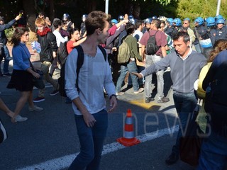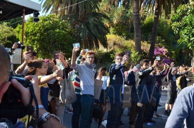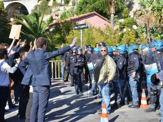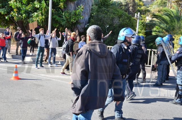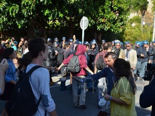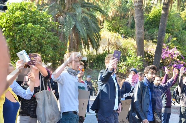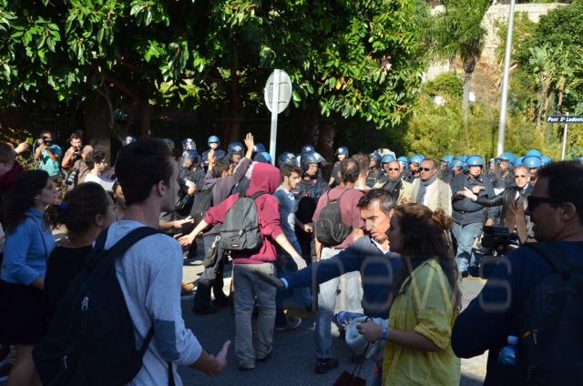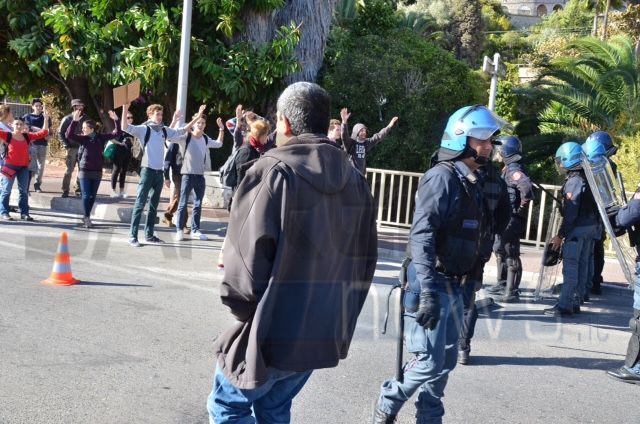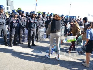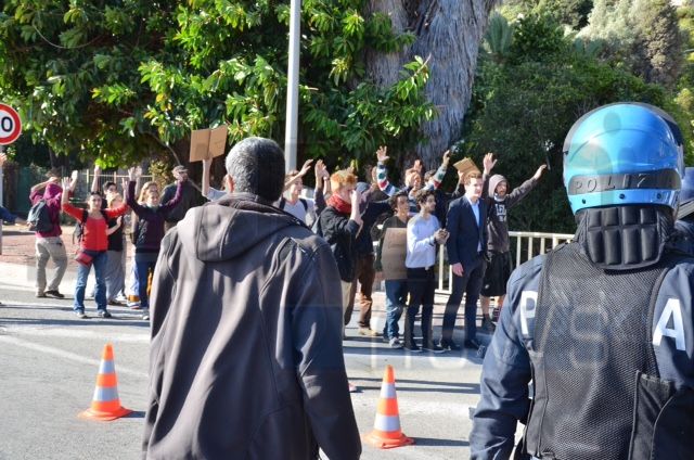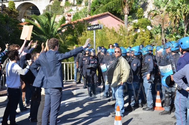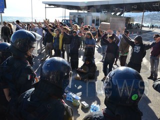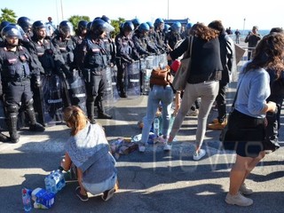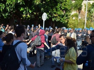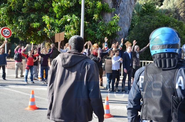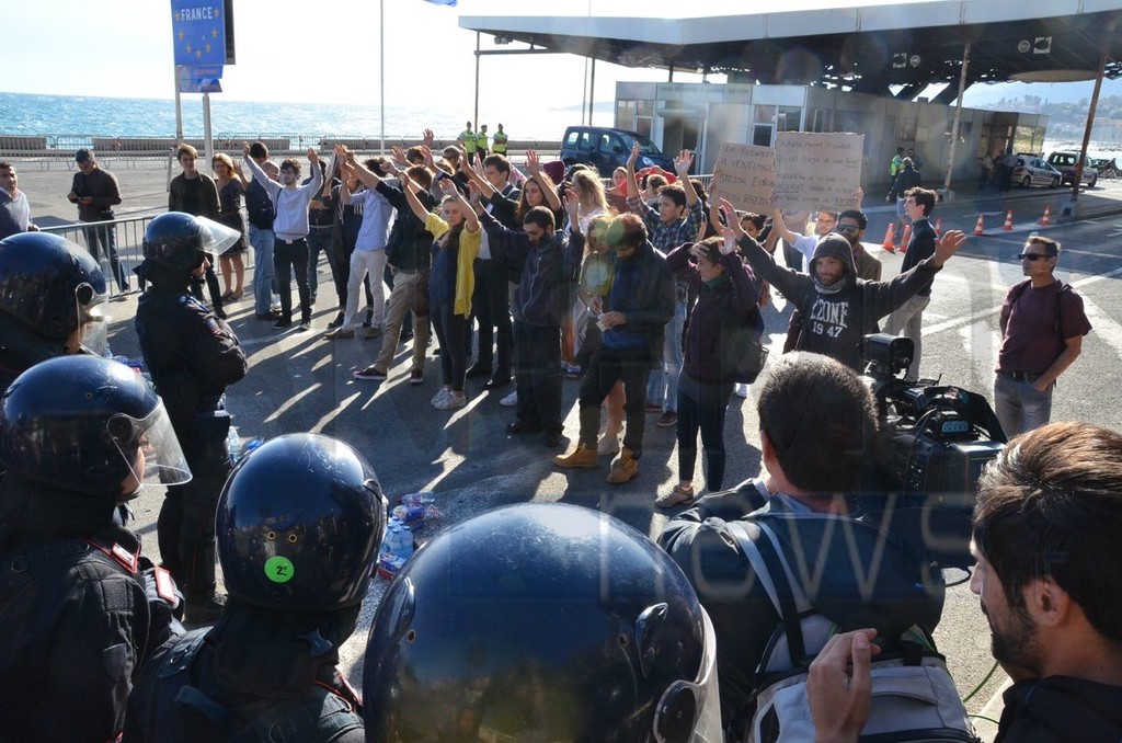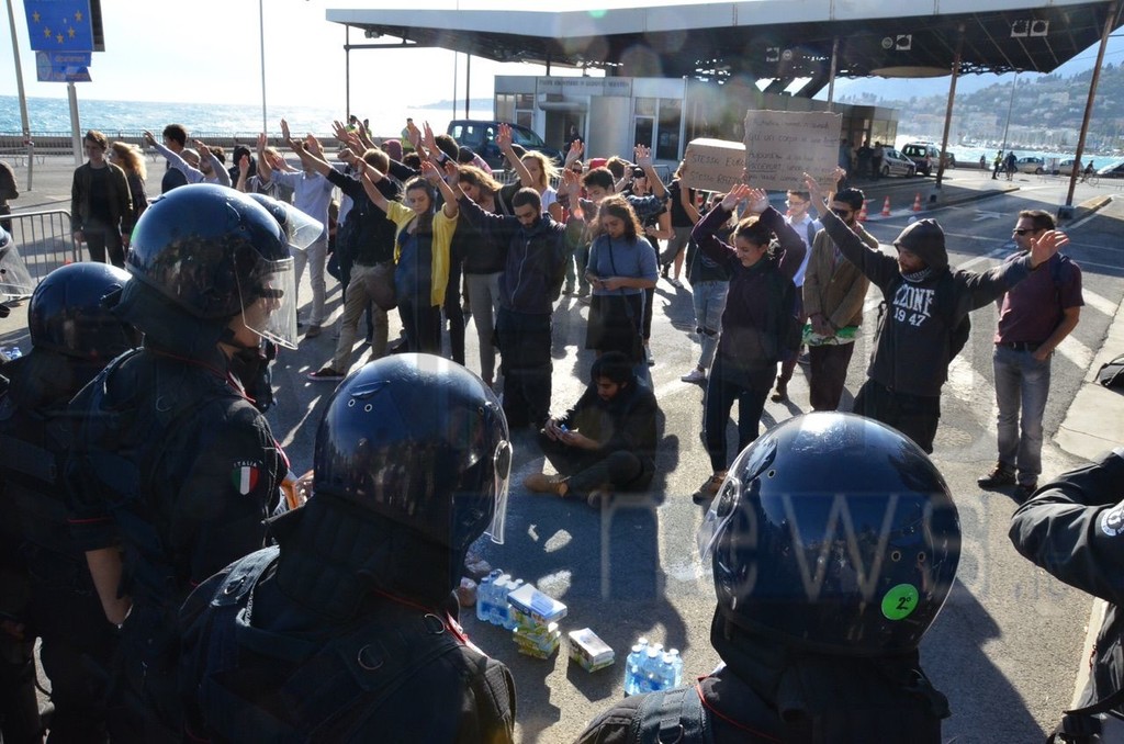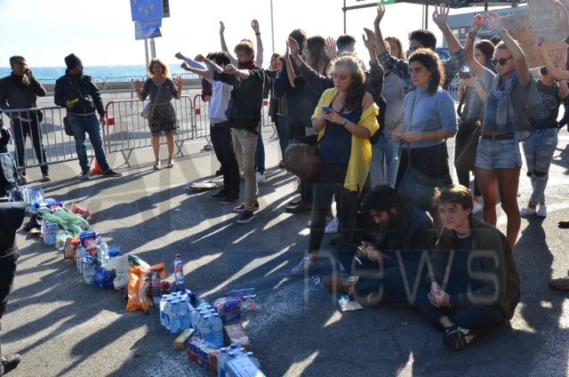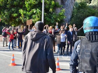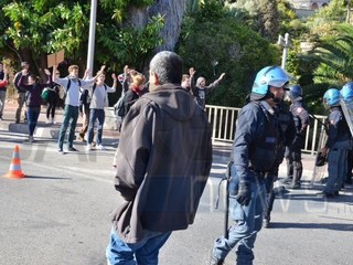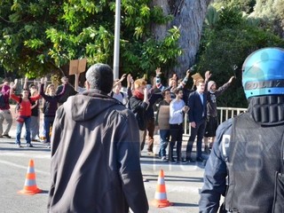 Faccia a faccia tra i No Border francesi ed il contingente delle forze dell'ordine che da stamattina sta cercando di smobilitare i restanti attivisti e migranti italiani che ancora una volta stanno occupando la scogliera di Ventimiglia.