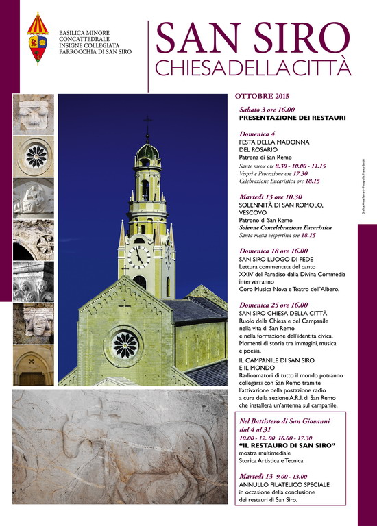 Verranno presentati sabato prossimo alle 16 i lavori di restauro da poco terminati, della Basilica di San Siro a Sanremo. I lavori sono iniziati nel giugno 2014 e terminati a settembre scorso. Sono stati impiegati 3.000 mq di ponteggio di altezza massima 20 metri per quanto riguarda la chiesa e 42 per il campanile.