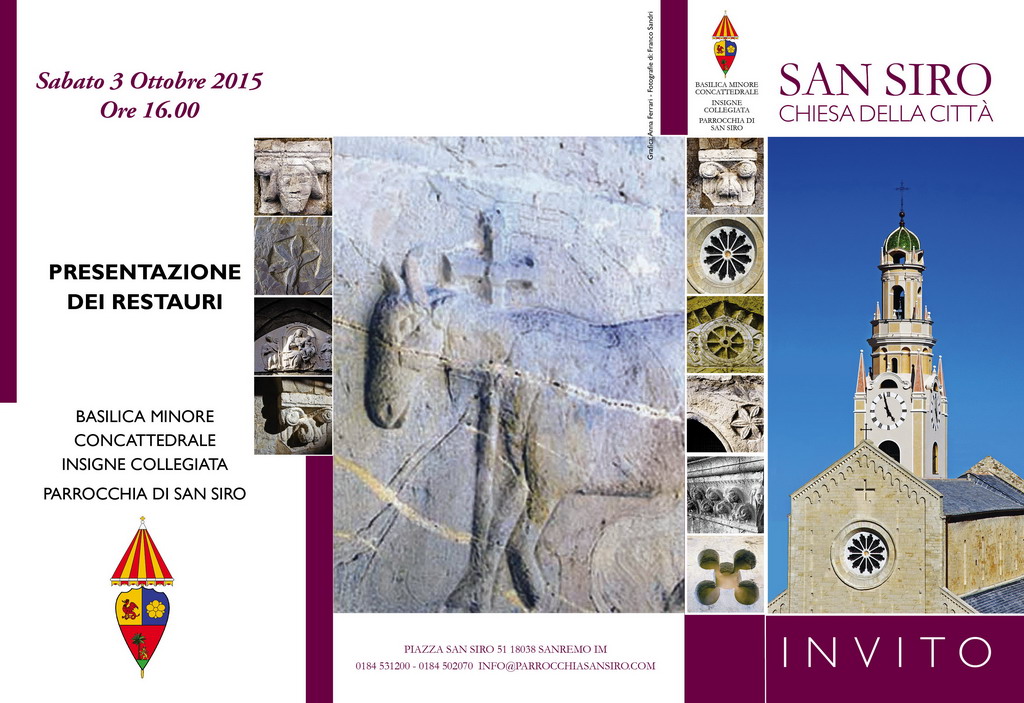 Verranno presentati i lavori di restauro della chiesa madre della città dei fiori, con Mons. Alvise Lanteri che farà gli onori di casa nella veste di Canonico Prevosto di San Siro. Sarà un pomeriggio che scorrerà tra storia, arte, musica, poesia e preghiera. Verrà presentata una vasta documentazione fotografica dei lavori svolti verrà presentata e si potranno acquistare il libro, le cartolina ed una pregevole stampa tutto materiale pubblicato per la specifica occorrenza.