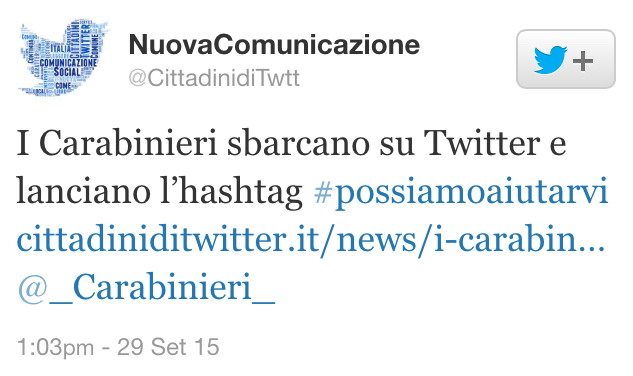 Da oggi i Carabinieri saranno presenti, per offrire il loro servizio, oltre che nelle strade cittadine e presso le loro caserme, anche su Twitter. Un ulteriore servizio per i cittadini e anche per gli stessi militari, che, diventando follower della Benemerita, potranno ricevere continue informazioni su eventi, concorsi, appuntamenti, operazioni di servizio e persino consigli utili.