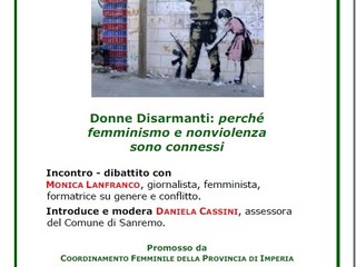 Sabato 10 ottobre, ore 16.30, a Palazzo Roverizio di Sanremo, a cura del Coordinamento Femminile della Provincia di Imperia, si terrà l’incontro- dibattito ‘Donne disarmanti: perché femminismo e nonviolenza sono connessi’.