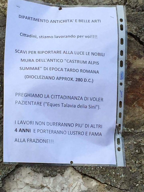 “Dipartimento Antichità e Belle Arti. Cittadini, stiamo lavorando per voi! Scavi per riportare alla luce le nobili mura dell’antico ‘Castrum Alpis Summae’ di epoca tardo romana (Diocleziano, approx. 280 d.C.). Preghiamo la cittadinanza di voler pazientare (“Eques talavia delia sini”). I lavori non dureranno più di altri 4 anni e porteranno lustro e fama alla frazione!”.