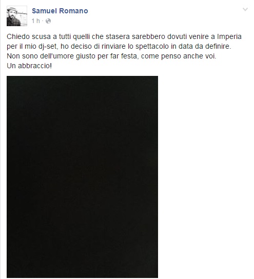 "Chiedo scusa a tutti quelli che stasera sarebbero dovuti venire a Imperia per il mio dj-set, ho deciso di rinviare lo spettacolo in data da definire. Non sono dell'umore giusto per far festa, come penso anche voi. Un abbraccio!".