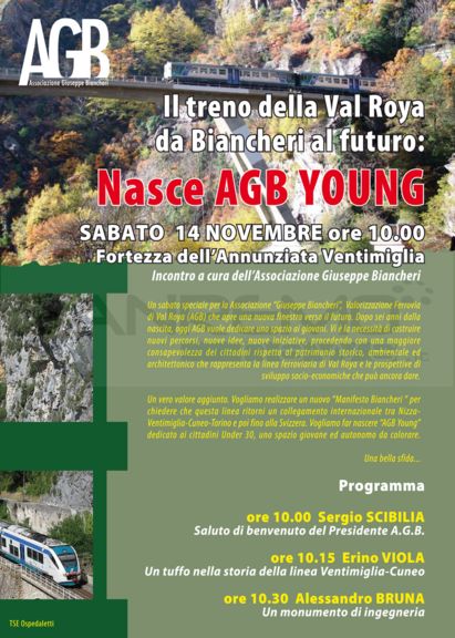 Oggi nasce l'AGB Young, un'associazione di giovani under 30 per la difesa della linea Cuneo-Ventimiglia. Presente il consigliere comunale Alessandro Ghirri, che quest'oggi al Forte dell'Annunziata rappresenta l'Amministrazione sostenendo questa iniziativa, trasmettendo una condivisione degli intenti dell'Associazione Giuseppe Biancheri.
