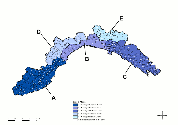 Relativamente ai Comuni facenti capo alle cinque zone di allerta della regione, ossia A) Bacini liguri marittimi di Ponente – B) Bacini liguri marittimi di Centro – C) Bacini liguri marittimi di Levante – D) Bacini liguri padani di Ponente – E) Bacini liguri padani di Levante, l’elenco è reperibile dal sito dell’A.R.P.A.L. o della Regione Liguria.
