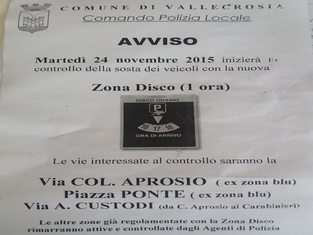 Martedì 24 novembre 2015 inizierà il controllo della sosta dei veicoli con la nuova “Zona Disco 1 ora”, si tratta di una fase di sperimentazione in vista della ‘rivoluzione’ che potrebbe scattare da Gennaio a causa dell’interruzione del servizio dovuto ad un contenzioso con la vecchia società Aipa S.p.A.