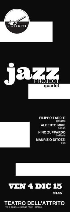 Si prospetta una nuova, doppia e importante iniziativa al Teatro de l'Attrito di Imperia. Venerdì 4 dicembre, alle ore 21.15 musica dal vivo con i "Jazz project quartet",Filippo Tarditi alla chitarra, Alberto Mike al basso, Nino Zuppardo alla batteria e Maurizio Ditozzi al sax.