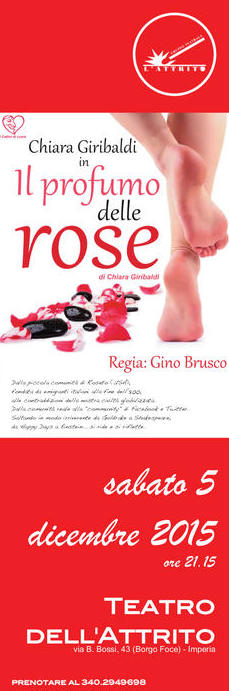 Per sabato 5 dicembre, sempre alla stessa ora, su prenotazione al numero di telefono 340 2949698, "Il profumo delle rose", spettacolo teatrale dei Cattivi di Cuore, di e con Chiara Giribaldi per la regia di Gino Brusco.