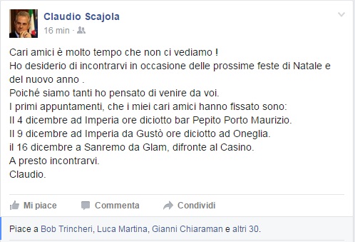 Scajola affida al proprio profilo Facebook l'annuncio del mini tour che partirà, in occasione delle feste natalizie, questo venerdì alle 18 al bar Pepito di via Cascione a Imperia e si concluderà il 16 dicembre al ristorante Glam di Sanremo.