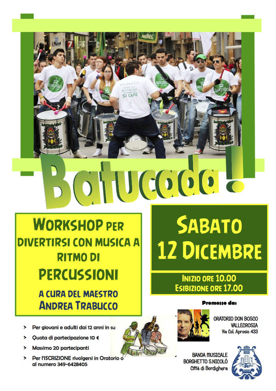 Sabato 12 dicembre presso l'Oratorio Don Bosco di Vallecrosia verrà proposto un workshop aperto a tutti per divertirsi con il ritmo della Batucada insieme al maestro genovese Andrea Trabucco. La Batucada è uno stile musicale del Samba con influenze africane basato sulle percussioni e suonato in gruppo.