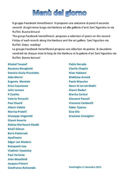 Nasce a Ventimiglia il gruppo VenerDiversi, per cui Ventimiglia il venerdì non è e non vuole essere solo mercato. Ecco il loro programma, dedicato alla poesia e alla letteratura.