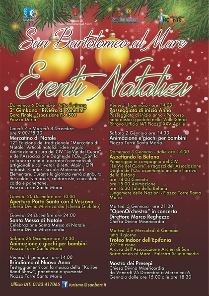 Aspettando l'Epifania e la Befana, San Bartolomeo al Mare propone diversi eventi per festeggiare insieme gli ultimi giorni delle festività di fine anno. Martedì pomeriggio, a partire dalle ore 14:00, in Piazza Santa Maria, sul Lungomare delle Nazioni, pomeriggio in compagnia del CIV "Le vie del Cuore" e dei ragazzi dell'Associazione Daghe de l'Oiu, con Cimento invernale, Animazione e - alle 16:30 - il Falò della Befana.