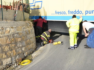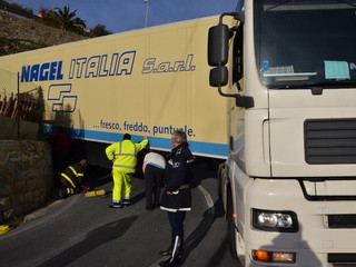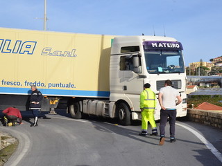 Un tir di nazionalità romena è rimasto incastrato in via Val d'Olivi a Sanremo. Il mezzo pesante che sembra trasporti surgelati ha imboccato la via erroneamente a causa del navigatore satellitare mentre in realtà la destinazione era valle Armea.