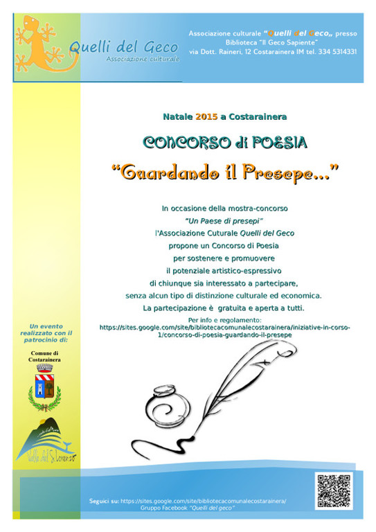Domani, domenica 10 gennaio 2016, a partire dalle ore 15.30 presso la sala consiliare del Municipio di Costarainera si svolgerà la cerimonia di premiazione dei concorsi 'Un paese di presepi' e 'Guardando il presepe' organizzati dall'Associazione culturale 'Quelli del Geco' con il patrocinio del Comune di Costarainera.