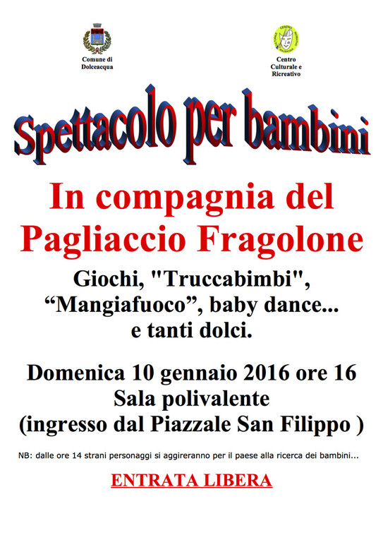 Per la domenica successiva all’Epifania il Centro Culturale e Ricreativo di Dolceacqua organizza il consueto spettacolo per i bambini con la merenda “della Befana” che tutte le feste si porta via, a chiusura degli eventi Natalizi del “Presepiando 2015”.