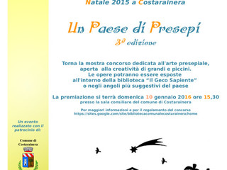 Domani, domenica 10 gennaio 2016, a partire dalle ore 15.30 presso la sala consiliare del Municipio di Costarainera si svolgerà la cerimonia di premiazione dei concorsi 'Un paese di presepi' e 'Guardando il presepe' organizzati dall'Associazione culturale 'Quelli del Geco' con il patrocinio del Comune di Costarainera.