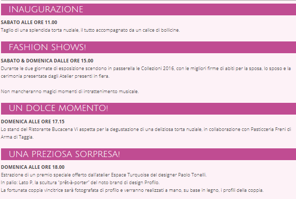 Durante le due giornate della manifestazione, alle 15, scenderanno in passerella le collezioni 2016 con le migliori firme per gli abiti da sposa, da sposo e da cerimonia, presentate dagli atelier partecipanti. Non mancheranno momenti musicali e domani pomeriggio alle 17.15 presso lo stand del ristorante 'Buca Cena' ci sarà la degustazione di una deliziosa torta nuziale, in collaborazione con la 'Pasticceria Freni' di Arma di Taggia. Sempre domenica alle 18 una preziosa sorpresa, l'estrazione di un premio speciale offerto dall'atelier del designer Paolo Tonelli.