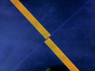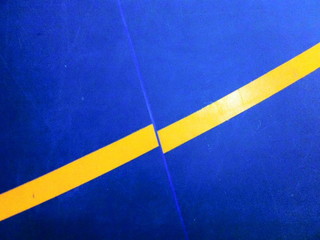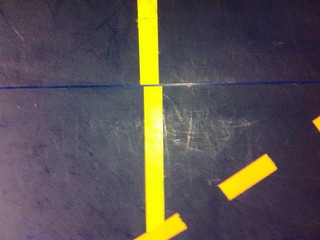 Condizioni fatiscenti per la pavimentazione della palestra Biancheri a Ventimiglia. Nelle foto è ben chiara la situazione con le strisce dei campi di pallamano e basket che non sono allineate, con ovvie difficoltà per la disputa delle partite.
