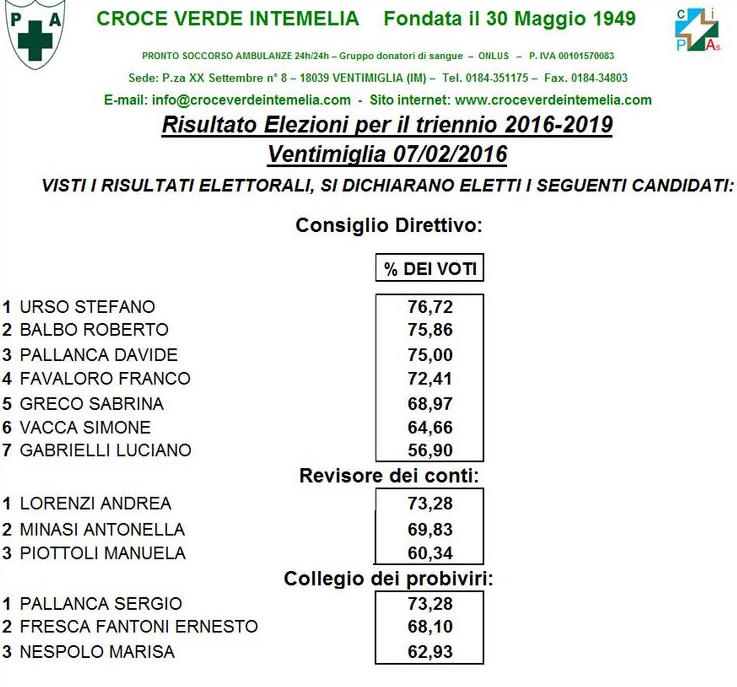 Ieri giornata di elezioni per la Croce verde Intemelia, che si è riunita per votare il rinnovo del Consiglio Direttivo. Il risultati per il triennio 2016-2019 ha visto i seguenti risultati: