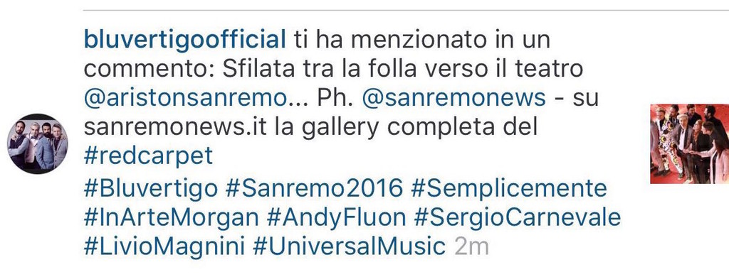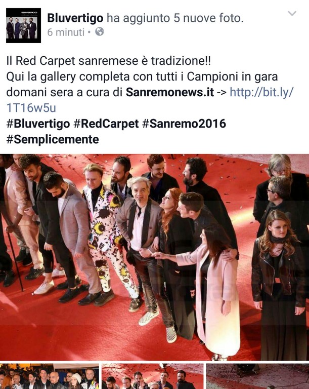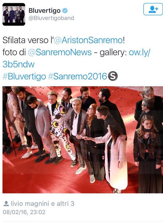 Così su Facebook, Twitter e Instagram il gruppo dei Bluvertigo ha postato le foto di Sanremo News commentando: "Il red carpet sanremese è tradizione! Qui la gallery completa con tutti i Campioni in gara, domani sera a cura di Sanremo news".