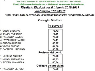 Ieri giornata di elezioni per la Croce verde Intemelia, che si è riunita per votare il rinnovo del Consiglio Direttivo. Il risultati per il triennio 2016-2019 ha visto i seguenti risultati: