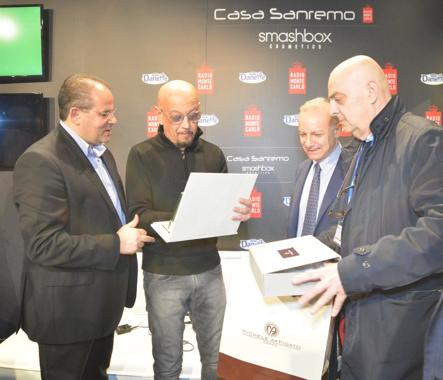Dopo la consegna del premio “Numeri uno Città di Sanremo”, quest’anno assegnato al noto produttore Tony Renis, l’orafo Michele Affidato, unitamente al vice Presidente dell’Afi Avv. Vittorio Costa, ai consiglieri Lino L’Acquaniti, Michele Schembri ed al responsabile Francesco Monteleone neghi studi di radio 105, hanno premiato Enrico Ruggeri, partecipanti a Sanremo tra i big, con il suo pezzo rock "Il primo amore non si scorda mai". L’artista ha molto apprezzato la manifattura del premio, composto da una base in cristallo dove è stato realizzato un bassorilievo in argento con la raffigurazione del logo dell’Afi e di un grammofono dipinto con smalti. Nella stessa giornata sono stati premiati anche Cecile, Camerunense nata a Roma, una delle cantanti più attese a Sanremo con il brano "N.E.G.R.A.", una canzone contro il razzismo, Chiara Dello Iacovo, l’istrionica cantautrice astigiana con “Introverso”, brano autografo nato dopo la partecipazione al talent “The Voice of Italy” e Irama, il più giovane tra le nuove proposte, nome che deriva da una parola malese che significa ritmo, elemento che identifica al meglio la sua indole, con il suo brano “Cosa Resterà”.
