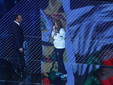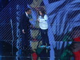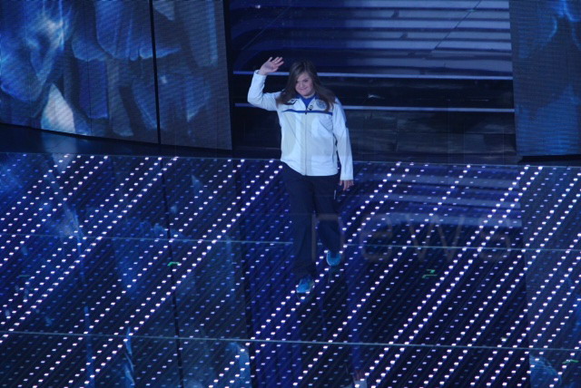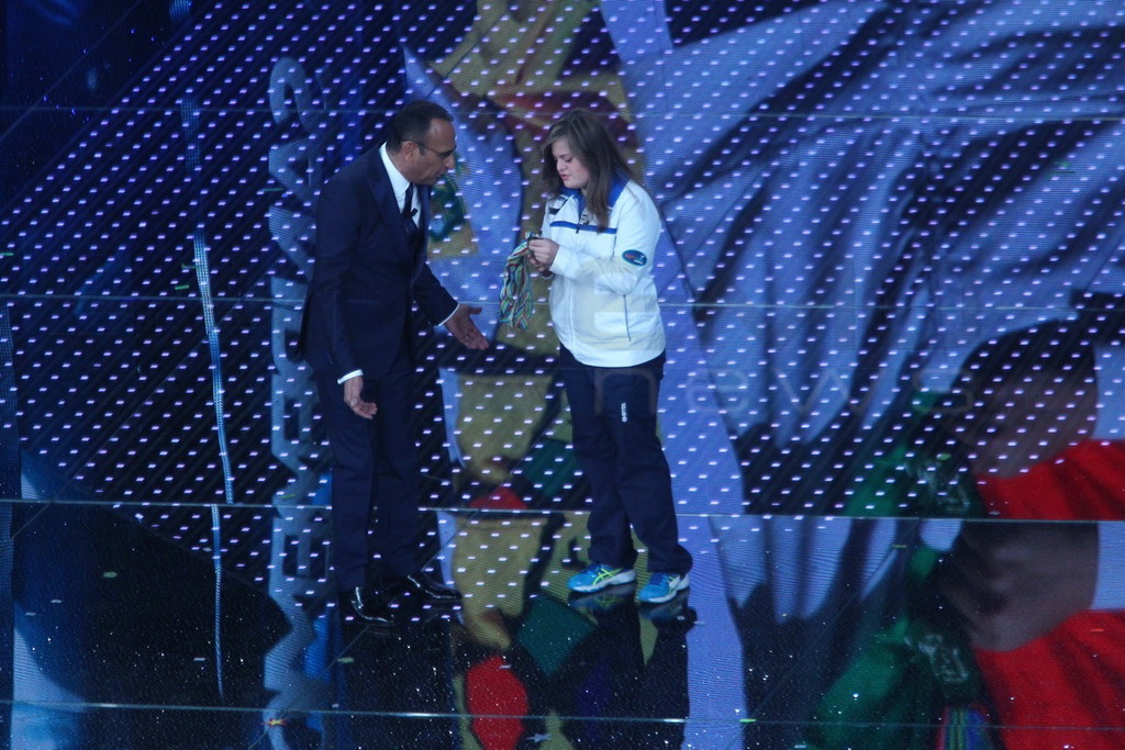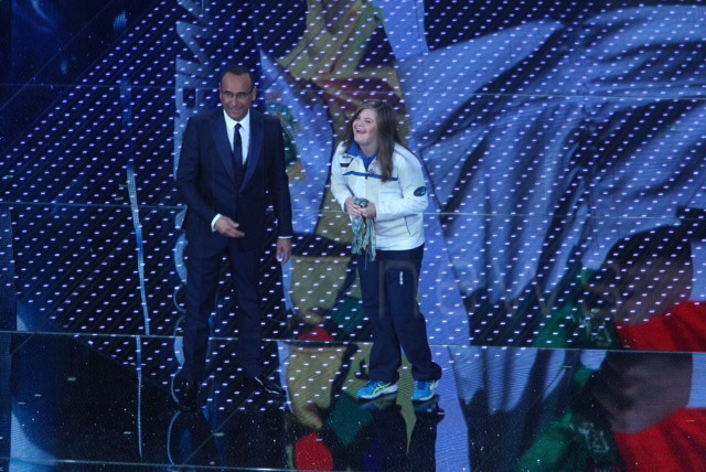 In attesa della partecipazione a 'Ballando con le stelle', l'atleta disabile Nicole Orlando è sul palco del Festival con le sue cinque medaglie, vinte ai Mondiali di atletica leggera in Sudafrica. E' commossa e cita la sua nonna, cui pensa quando ascolta 'Angelo' di Francesco Renga.
