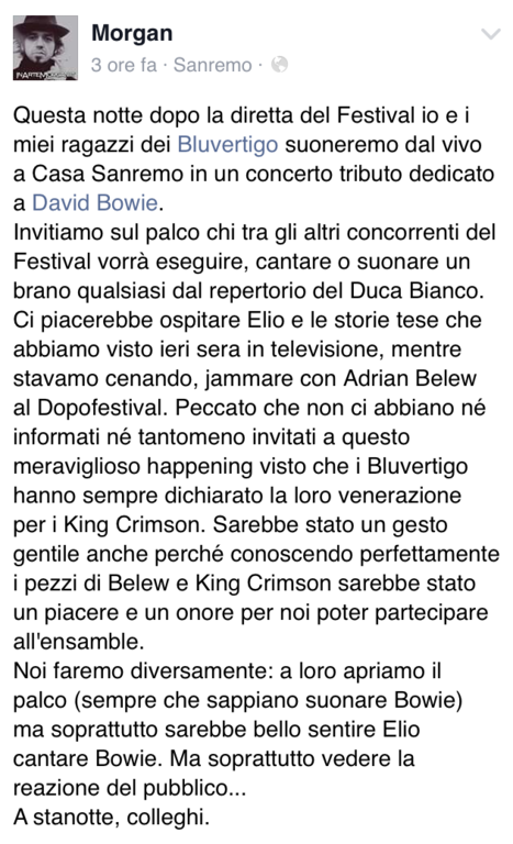 "Questa notte dopo la diretta del Festival io e i miei ragazzi dei Bluvertigo suoneremo dal vivo a Casa Sanremo in un concerto tributo dedicato a David Bowie - ha scritto Morgan nel suo post su Facebook - Invitiamo sul palco chi tra gli altri concorrenti del Festival vorrà eseguire, cantare o suonare un brano qualsiasi dal repertorio del Duca Bianco. Ci piacerebbe ospitare Elio e le storie tese che abbiamo visto ieri sera in televisione, mentre stavamo cenando, jammare con Adrian Belew al Dopofestival".