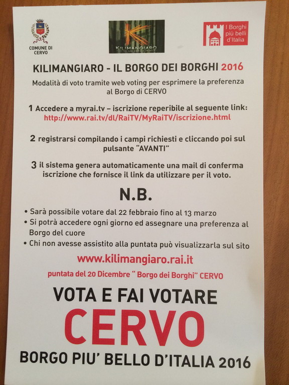 “Invito tutti i cittadini della nostra provincia a votare Cervo come “borgo dei borghi”. Si tratta di una località affascinante che rappresenta la Liguria al concorso lanciato dalla trasmissione di RaiTre “Kilimangiaro”. Non dobbiamo lasciarci scappare questa opportunità per portare in alto una delle eccellenze turistiche del nostro territorio”. Con queste parole il Presidente della Provincia Fabio Natta invita tutti ad esprimere il voto via web da lunedì 22 febbraio a domenica 13 marzo secondo le modalità previste: occorre prima registrarsi accedendo a myrai.tv - iscrizione (QUI) e seguendo tutte le istruzioni (il sistema genera automaticamente una mail di conferma dell’iscrizione che fornisce il link da utilizzare per il voto), poi nel periodo della votazione, ogni giorno, si potrà assegnare la preferenza al borgo preferito. I risultati della votazione saranno resi noti domenica 27 marzo, giorno di Pasqua, in prima serata, su Rai Tre a ‘Kilimangiaro’.