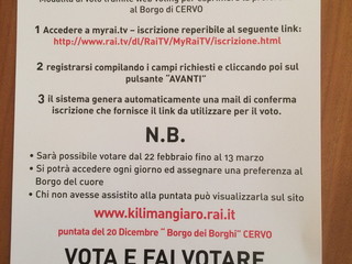 “Invito tutti i cittadini della nostra provincia a votare Cervo come “borgo dei borghi”. Si tratta di una località affascinante che rappresenta la Liguria al concorso lanciato dalla trasmissione di RaiTre “Kilimangiaro”. Non dobbiamo lasciarci scappare questa opportunità per portare in alto una delle eccellenze turistiche del nostro territorio”. Con queste parole il Presidente della Provincia Fabio Natta invita tutti ad esprimere il voto via web da lunedì 22 febbraio a domenica 13 marzo secondo le modalità previste: occorre prima registrarsi accedendo a myrai.tv - iscrizione (QUI) e seguendo tutte le istruzioni (il sistema genera automaticamente una mail di conferma dell’iscrizione che fornisce il link da utilizzare per il voto), poi nel periodo della votazione, ogni giorno, si potrà assegnare la preferenza al borgo preferito. I risultati della votazione saranno resi noti domenica 27 marzo, giorno di Pasqua, in prima serata, su Rai Tre a ‘Kilimangiaro’.