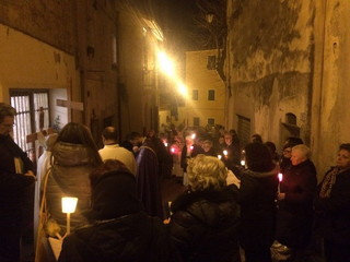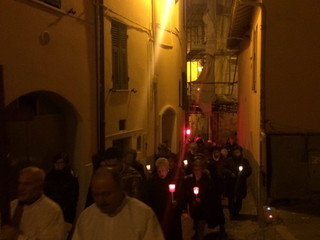 Partito dalla centralissima chiesa di San Sebastiano alle 20,30, il corteo di fedeli era preceduto dalla corale parrocchiale in un pellegrinaggio urbano ai quattordici altari predisposti nei vicoli, nei cortili e sui terrazzi delle case storiche del borgo medievale. Un suggestivo percorso di fede marcato da centinaia di lumi accesi, simbolo di partecipazione alla passione di Cristo. Oltre alle preghiere recitate insieme a don Yaro ed alle meditazioni lette dai fedeli, i canti sacri davanti agli altari sollecitavano gli abitanti ad affacciarsi alle finestre ed a partecipare in raccoglimento alla celebrazione itinerante, così che il corteo dapprima modesto andava via via raccogliendo nuovi devoti, fino ad assumere al rientro in parrocchia, la dimensione di una corposa processione.