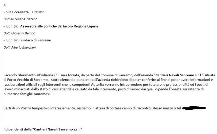 "Il 17 febbraio scorso, apprendendo (da catene e lucchetti apposti tipo prigione) la determinazione a chiudere l’azienda 'Cantieri Navali Sanremo S.r.l' (senza i 'se' ed i 'ma' sempre coscienziosamente anteposti dalle precedenti amministrazioni a tutela del lavoro e dei lavoratori) da parte dell’Amministrazione di Palazzo Bellevue guidata dal Sindaco Biancheri, noi dipendenti abbiamo provveduto ad inoltrare la seguente richiesta alle Autorità competenti: cliccando QUI"lettera cantieri.