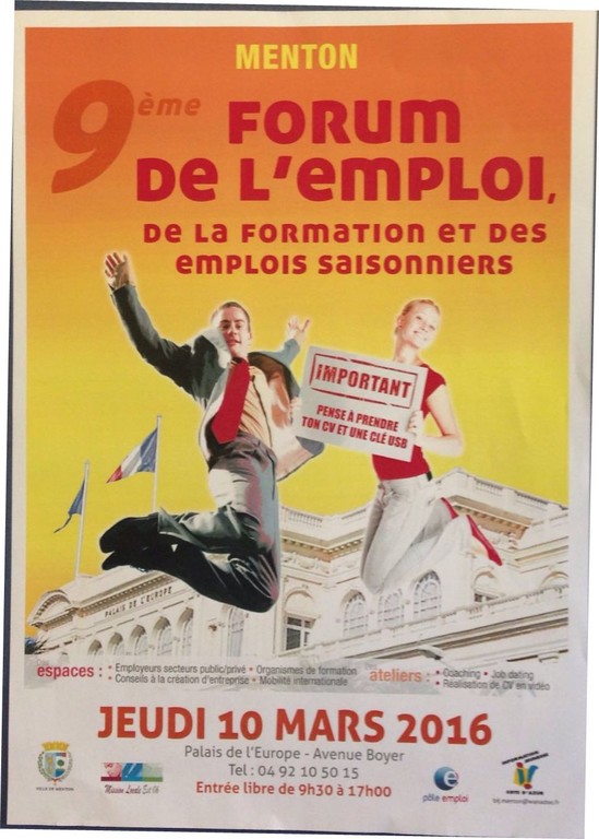 La città di Mentone organizza la 9° edizione del Forum per l’Impiego. Giovedì 10 marzo dalle 9.30 alle 17, il Palais de l’Europe si trasformerà in fiera del lavoro: in una sessantina di stand saranno presenti aziende, agenzie interinali o professionisti, tra cui la Chambre des metiers et artisanat, il Montecarlo Country Club e molti altri.