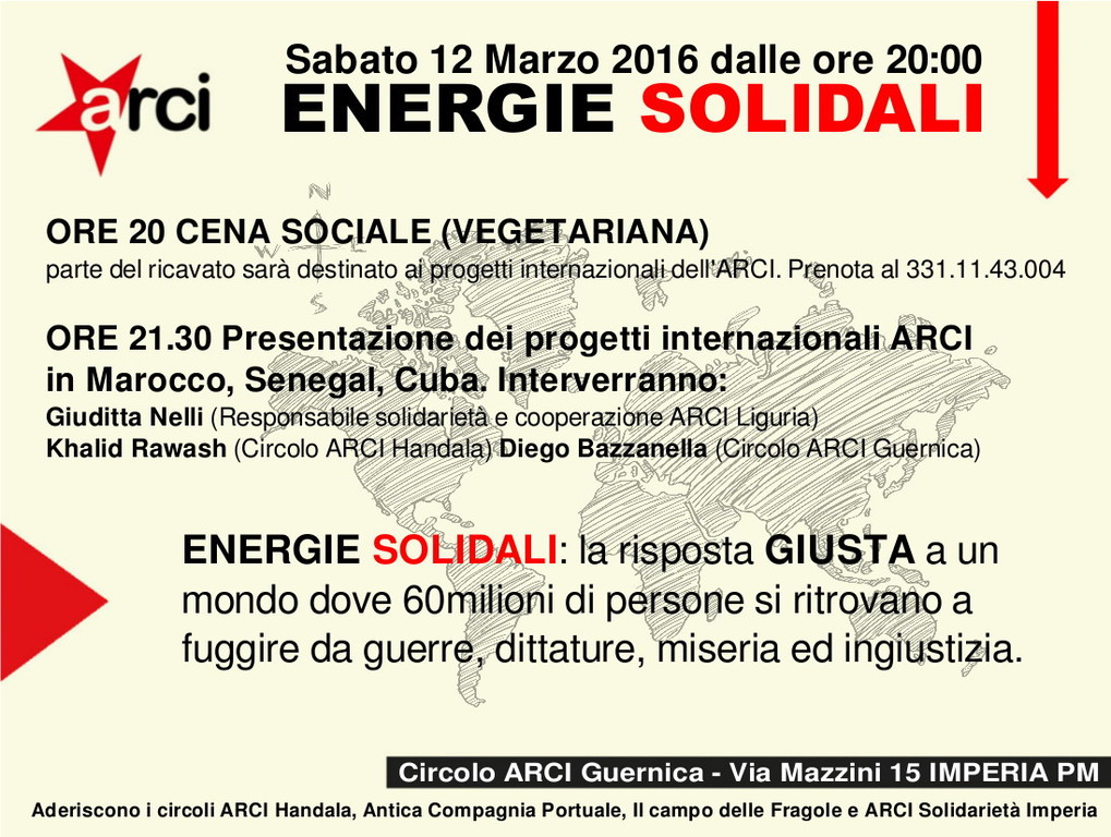 Sabato sarà presente una protagonista dei progetti: Giuditta Nelli, la responsabile solidarietà e cooperazione di ARCI Liguria. Per finanziare una di queste campagne internazionali abbiamo organizzato, come sempre al Guernica, una cena vegetariana conviviale che avrà luogo alle 20 e che precederà il racconto e i video che inizieranno alle 21.30 pressi i locali del Circolo ARCI Guernica di Via Mazzini 15 a Imperia Porto Maurizio. Hanno aderito all’iniziativa altri circoli ARCI della città (Antica Compagnia Portuale, il Campo delle Fragole, Handala). Interverranno anche il medico Khalid Rawash (ARCI) e Belkouk Mbarek (Associazione dei giovani magrebini d’Italia). Allego la locandina della serata. Tutte e tutti sono invitati a partecipare. I soci ARCI che verranno già alla cena sono pregati di prenotare al 331.11.43.004.