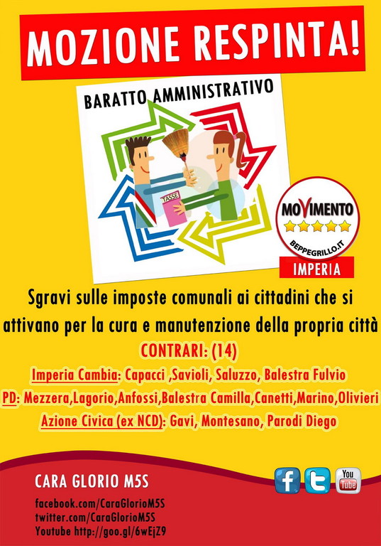1) Il baratto amministrativo, una mozione che avrebbe concesso la possibilità a tutti coloro che si ritrovano ad avere debiti o ritardi di pagamento nei confronti dell'ente pubblico, di compensare (barattare) la propria situazione debitoria effettuando lavori socialmente utili o disponibilità ad adoperarsi professionalmente.
