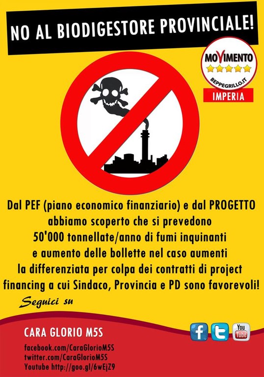 2) Abbiamo studiato e approfondito tutto il progetto tecnico ed il piano economico finanziario del famoso Biodigestore che la Provincia vuole realizzare a Colli (Arma di Taggia- Bussana), anche grazie al contributo di alcuni Portavoce Parlamentari pentastellati come Alberto Zolezzi esperto sul tema 'biogas', traendone un quadro molto preoccupante per la salute di tutti gli abitanti. Siamo stati gli unici assieme al consigliere Servalli (I.B.C.) durante la votazione in C.C. ad esprimere parere negativo.
