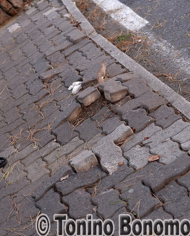 Per i passanti è difficilissimo transitare in alcune zone dello striminzito marciapiedi ed anche il camminamento nelle zone più ‘tranquille’ è comunque pericoloso, per la rottura in molti punti del ciottolato.