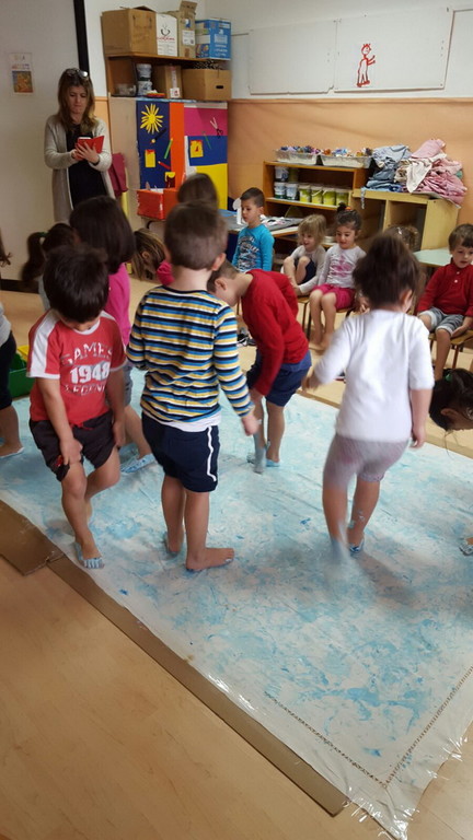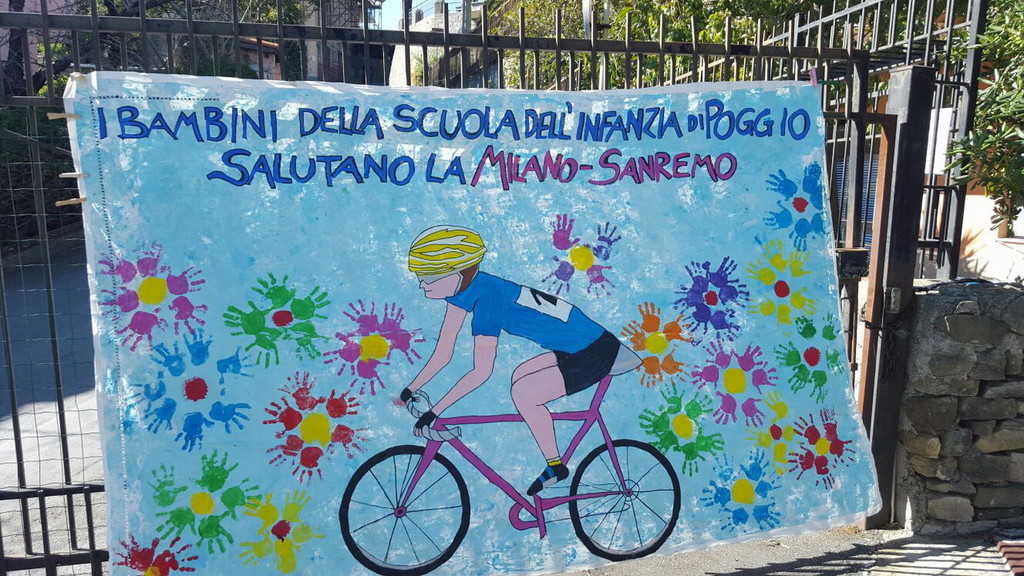 Quest'anno i bambini della Scuola dell'Infanzia di Poggio hanno deciso di partecipare alla Milano-Sanremo 'a modo loro', visto che attraversa proprio la loro frazione. Con l'aiuto delle maestre e della collaboratrice hanno realizzato uno striscione della grandezza di cm. 2,70 X cm. 1,70 divertendosi moltissimo poiché, invece dei pennelli, hanno usato i loro piedini 'pucciati' nella pittura azzurra per realizzare il cielo ed il mare e le manine per comporre i fiori. Il risultato finale è davvero magnifico! Lo striscione verrà affisso lungo il giro del Poggio così che i bambini possano salutare la Milano-Sanremo.