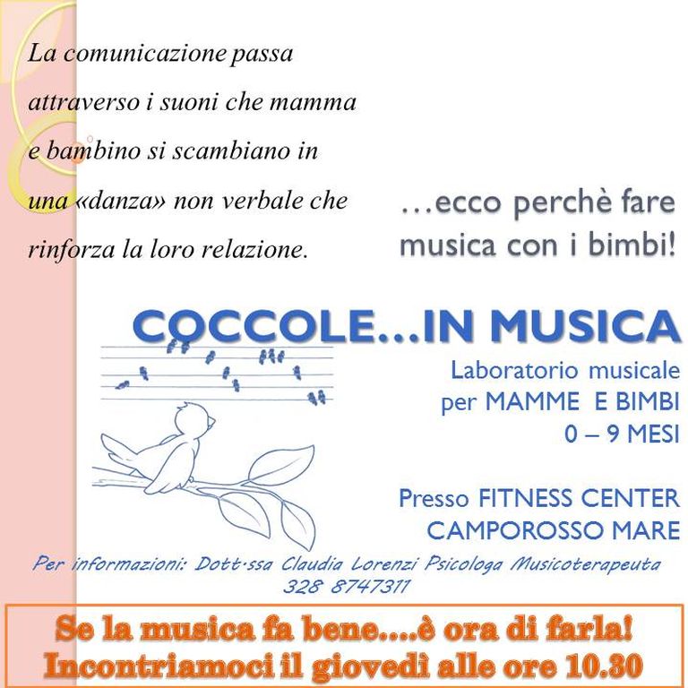 Al termine del percorso la mamma avrà costruito un piccolo percorso da riproporre a casa per continuare a fare musica e divertirsi insieme ritagliandosi momenti di intensa condivisione con il bambino. Per ulteriori informazioni contattare dott.ssa Lorenzi Claudia, conduttrice degli incontri, al numero 3288747311.