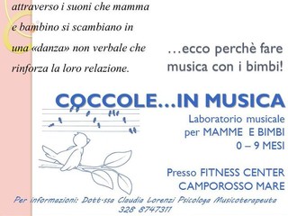 Al termine del percorso la mamma avrà costruito un piccolo percorso da riproporre a casa per continuare a fare musica e divertirsi insieme ritagliandosi momenti di intensa condivisione con il bambino. Per ulteriori informazioni contattare dott.ssa Lorenzi Claudia, conduttrice degli incontri, al numero 3288747311.