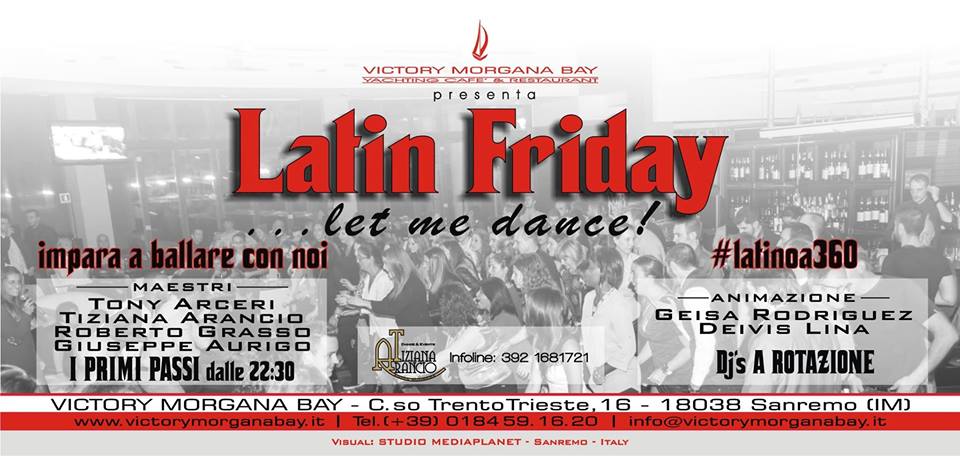 "Arriva il venerdì, arriva il Latino! Appuntamento al Victory Morgana Bay con i ritmi caraibici: in preserata 'impara a ballare con noi' per muovere i primi passi di merengue salsa e bachata con i maestri della provincia tutti insieme 'only for you'. A seguire 'Se bailaaaa' con La selezione musicale di Dj Roby El Gordo. L'animazione è a cura di Geisa Rodriguez (Cuba) e Deivis Lina ( Santo Domingo). Organizzazione e Regia di 'Anima Rumbera Tiziana Arancio'.