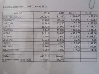 I dati infatti, inconfutabili in quanto ricavati dalla pesa effettuata dall’impianto, sono di gran lunga superiori rispetto a quanto richiesto dalla Regione. Le direttive parlano, in termini di obiettivi, di raggiungere il 45% entro il 2016 e il 65% entro il 2020. Nello specchietto tra i valori più significativi ci sono quelli relativi all’indifferenziato, che passa da 292 tonnellate (2015) a 51 tonnellate (2016), e all’organico conferito che passa da 15 tonnellate a 90.