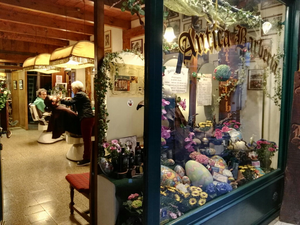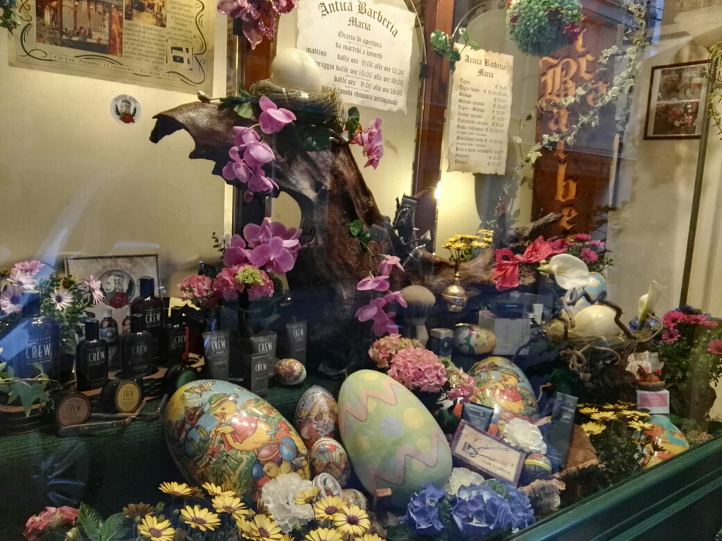 Soddisfazione del Sindaco Biancheri, nel vedere la professionalità e l'armonia di come è stata allestita la vetrina dalla bravissima Visual Merchandiser Cetty che, tra antichi rasoi e attrezzatura da barbiere, sembrano sbocciare da un prato verde, meravigliose margherite, ortensie e calle. La Pasqua è stata simbolicamente rappresentata da composizioni fatte con grandi uova pasquali. Un omaggio visivo floreale. che l'antica bottega artigiana rende non solo ai suoi clienti ma ai molti turisti che transitano nella piccola via dedicata a Capitan Pesante.