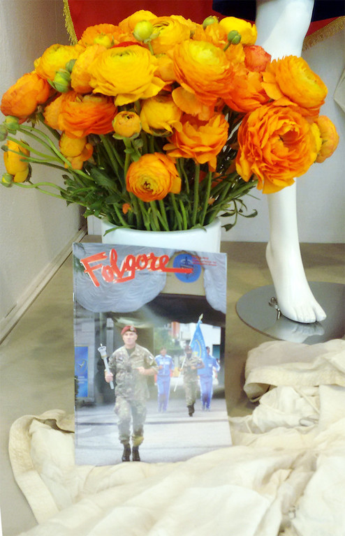 "Nell'occasione la Maison DAPHNÉ di Sanremo dedica una patriottica vetrina al corpo dei paracadutisti italiani esponendo tra i propri abiti di Haute Couture un paracadute, accompagnato dalla bandiera italiana, e non possono mancare i nostri fiori di Sanremo nelle sfolgoranti tonalità giallo arancio.